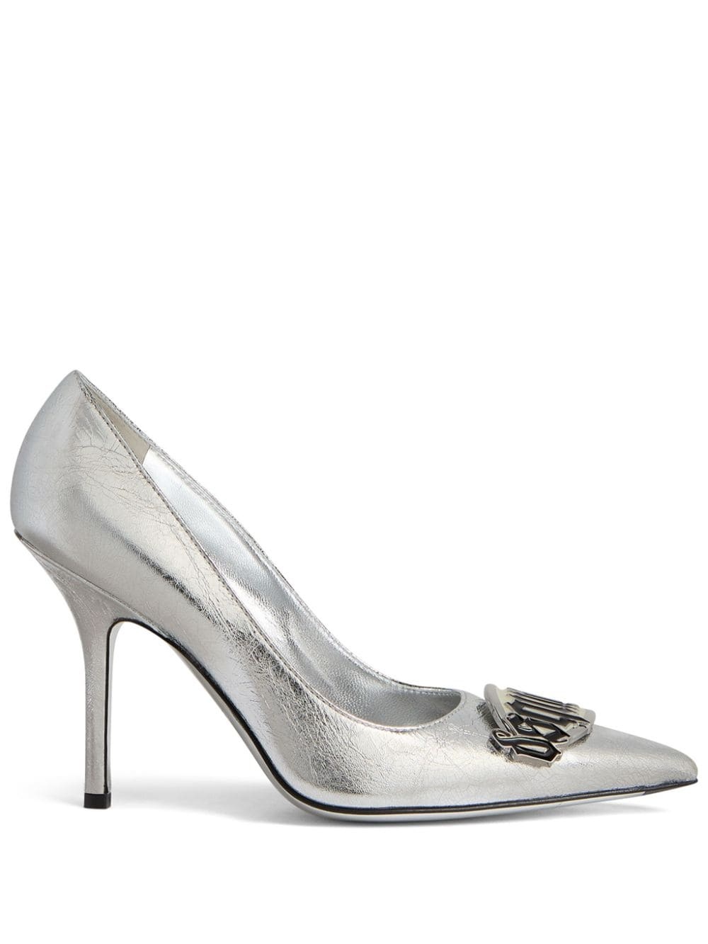 100mm logo-plaque leather pumps Highlights - Silver-tone - Leather - Metallic finish - Logo plaque - Pointed toe - Slip-on style - Branded leather insole - 100mm stiletto heel - Leather sole Made in Italy Composition Outer: Goat Skin 100% Lining: Goat Skin 100% Sole: Leather 95%, Polyurethane 5%