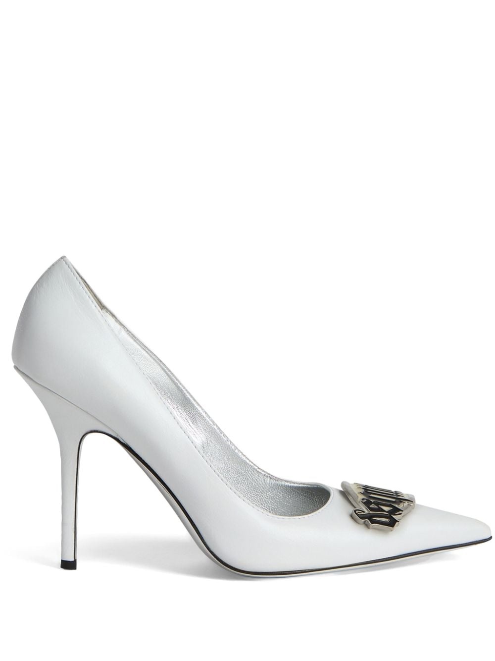 100mm logo-plaque leather pumps Highlights - Optical white - Calf leather - Logo plaque - Pointed toe - Slip-on style - Branded leather insole - 100mm stiletto heel - Leather sole Made in Italy Composition Sole: Calf Leather 100% Lining: Goat Skin 100% Outer: Calf Leather 100%