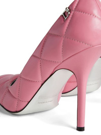 100mm quilted leather pumps Highlights - Bubblegum pink - Lambskin - Padded design - Quilted - Tonal stitching - Silver-tone logo plaque - Pointed toe - Slip-on style - Branded leather insole - 100mm stiletto heel - Leather sole Made in Italy Composition Lining: Goat Skin 100% Outer: Lamb Skin 100% Sole: Lamb Skin 100%