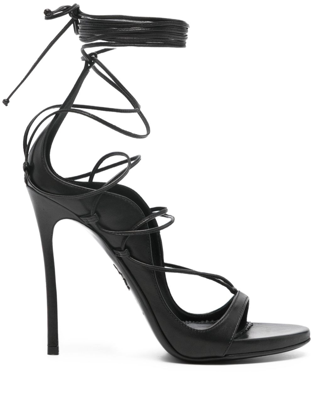 105mm leather heeled sandals Highlights - Black - Front lace-up fastening - Stiletto heel - Open round toe - Stiletto heel - Branded insole Made in Italy Composition Outer: Calf Leather 100% Lining: Calf Leather 100% Sole: Calf Leather 100% SIZE & FIT Measurement HEEL 4.13 in(10.5 cm)