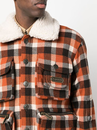 check-print shearling jacket DSquared2 nods to its Canadian heritage with this jacket, inspired by classic lumberjack styles. The virgin-wool blend construction is presented in a bold orange and brown check print and finished with soft shearling lining. Highlights - Burnt orange/chocolate brown - Virgin wool blend - Check print - Logo patch at the chest - Spread collar - Front press-stud fastening - Long sleeves - Multiple cargo pockets - Shearling lining Made in Italy Composition Outer: Polyester 84%, Virgin Wool 50%, Cotton 34%, Polyamide 16%, Acrylic 16% Lining: Cotton 100%, Polyester 100% SIZE & FIT Model measurements Height 6 ft 0 in(1.84 m) Bust/Chest 36.22 in(92 cm) Hips 35.43 in(90 cm) Waist 26.77 in(68 cm) FittingInformation This piece fits true to size. We recommend you get your regular size Cut for a loose fit Made with a mid-weight non-stretch fabric Washing instructions Dry Clean Only