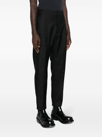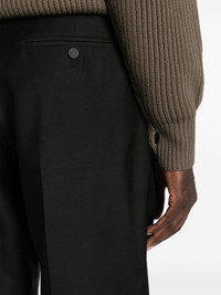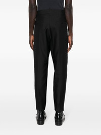 Cigarette tailored-cut trousers Highlights - Black - Virgin wool-silk blend - Pressed crease - Slim cut - Tailored cut - Mid-rise - Belt loops - Hook and zip fly fastening - Two side inset pockets - Two rear button-fastening jetted pockets Made in Italy Composition Outer: Virgin Wool 65%, Silk 35% Lining: Polyester 100% SIZE & FIT Model measurements Height 6 ft 2 in(1.87 m) Bust/Chest 36.41 in(92.5 cm) Hips 37 in(94 cm) Waist 29.52 in(75 cm) FittingInformation Designed for a tapered leg, offering a loose unrestricted fit over the leg with a closer fit towards the ankle Made from a midweight non-stretch fabric This piece fits true to size – take your usual size Washing instructions Dry Clean Only