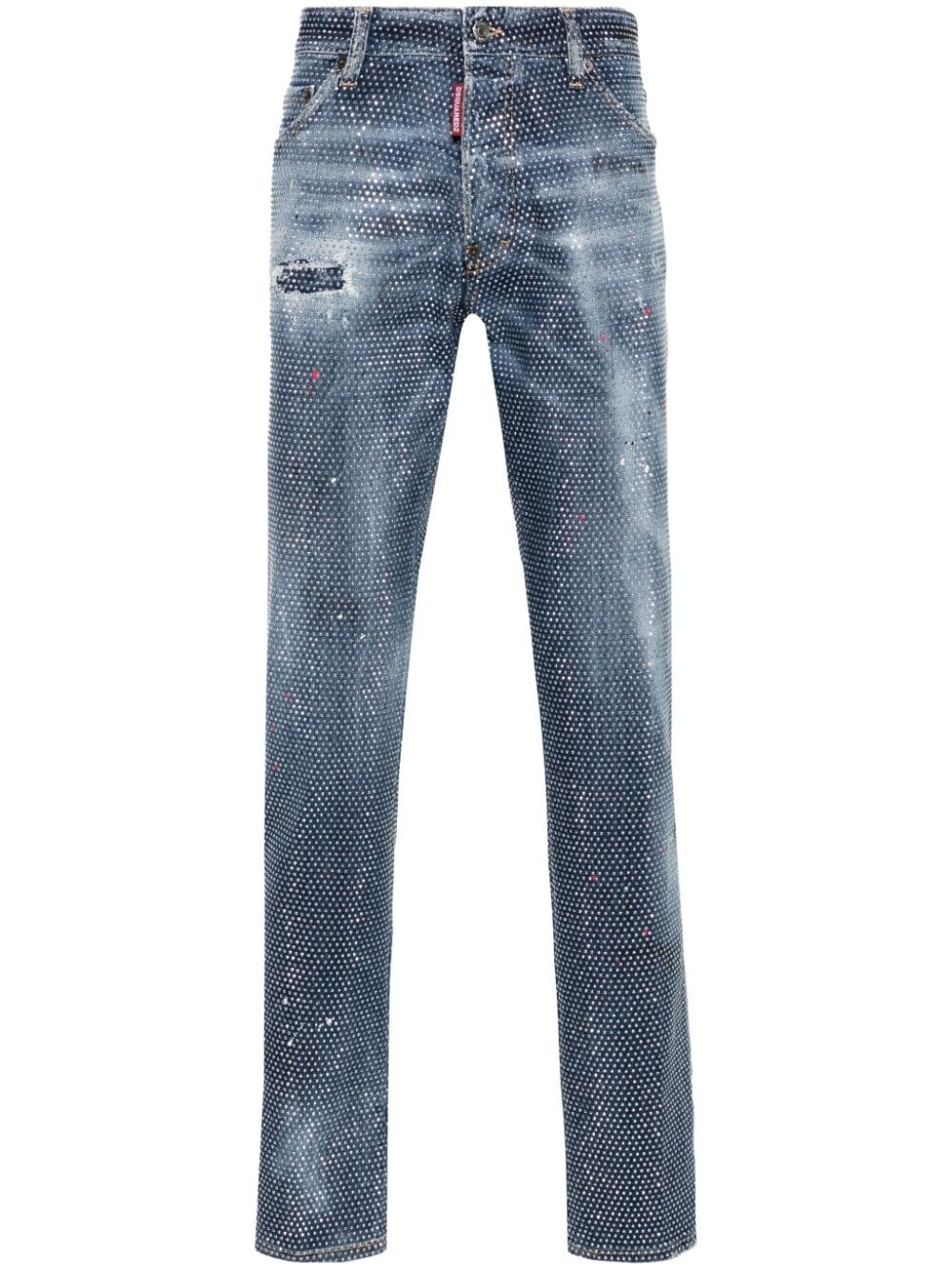 Cool Guy studded mid-rise slim jeans Highlights - Indigo blue - Stretch-cotton - Denim - Faded effect - Silver-tone stud embellishment - Distressed finish - Ripped detailing - Paint splatter detail - Whiskering effect at the thighs - Mini logo tag - Slim cut - Mid-rise - Button fly fastening - Belt loops - Classic five pockets - Straight hem Made in Italy Composition Outer: Aluminium 100%, Cotton 98%, Spandex/Elastane 2% Lining: Polyester 65%, Cotton 35% SIZE & FIT Model measurements Height 6 ft 2 in(1.88 m) Bust/Chest 36.61 in(93 cm) Hips 35.82 in(91 cm) Waist 27.95 in(71 cm) FittingInformation Designed for a slim fit, these jeans offer a comfortable fit that sits just away from the leg Constructed from stretch denim, this piece offers a stretch fit with durability This piece fits true to size – take your usual size