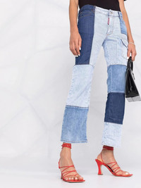 cropped patchwork pocket-detail jeans The SS22 collection by Dsquared2 draws inspiration from a combination of references which are reflected in the construction techniques used in the designs - notably patchwork. The panelled design and patch pocket of these cropped trousers combines a variety of blue tonal hues and wash-effects to reflect this season's amalgamation of concepts. Made in Italy Composition Outer: Cotton 98%, Spandex/Elastane 2% Lining: Polyester 65%, Cotton 35% SIZE & FIT Model measurements Height 5 ft 9 in(1.76 m) Bust/Chest 31.88 in(81 cm) Hips 35.43 in(90 cm) Waist 24.8 in(63 cm) FittingInformation This piece fits true to size. We recommend you get your regular size Designed to be fitted at the waist and through the thigh, loose from the knee Made with a mid-weight stretch fabric Washing instructions Dry Clean Only