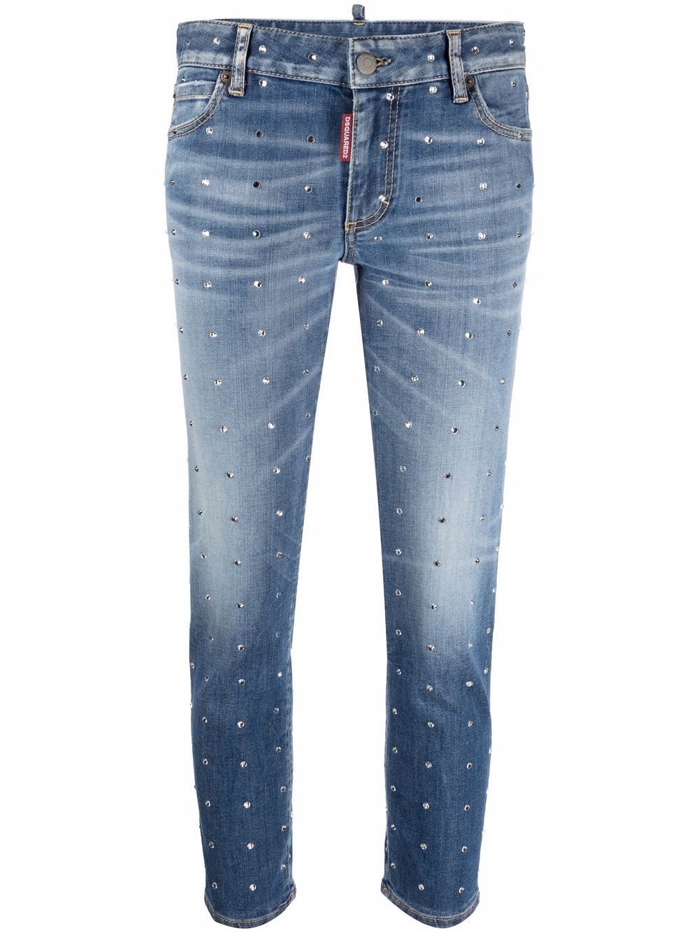 crystal-embellished cropped jeans blue cotton-blend crystal embellishment cropped skinny cut front button and zip fastening low-rise belt loops classic five pockets Made in Italy Composition Outer: Cotton 92%, Polyester 6%, Spandex/Elastane 2% Lining: Polyester 65%, Cotton 35% SIZE & FIT Model measurements Height 5 ft 10 in(1.77 m) Bust/Chest 35.03 in(89 cm) Hips 35.03 in(89 cm) Waist 23.62 in(60 cm) FittingInformation This piece fits true to size. We recommend you get your regular size Cut for a slim fit Made with a mid-weight stretch fabric Washing instructions Dry Clean Only