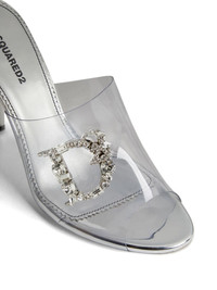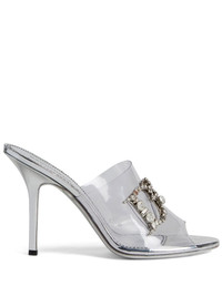 crystal-embellished logo mules Highlights - Silver-tone - Leather - Crystal embellishment - Transparent strap - Open toe - Slip-on style - Branded leather insole - Stiletto heel - Leather sole Made in Italy Composition PVC 100%