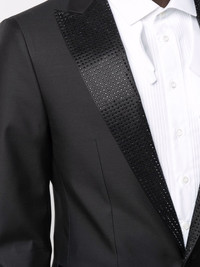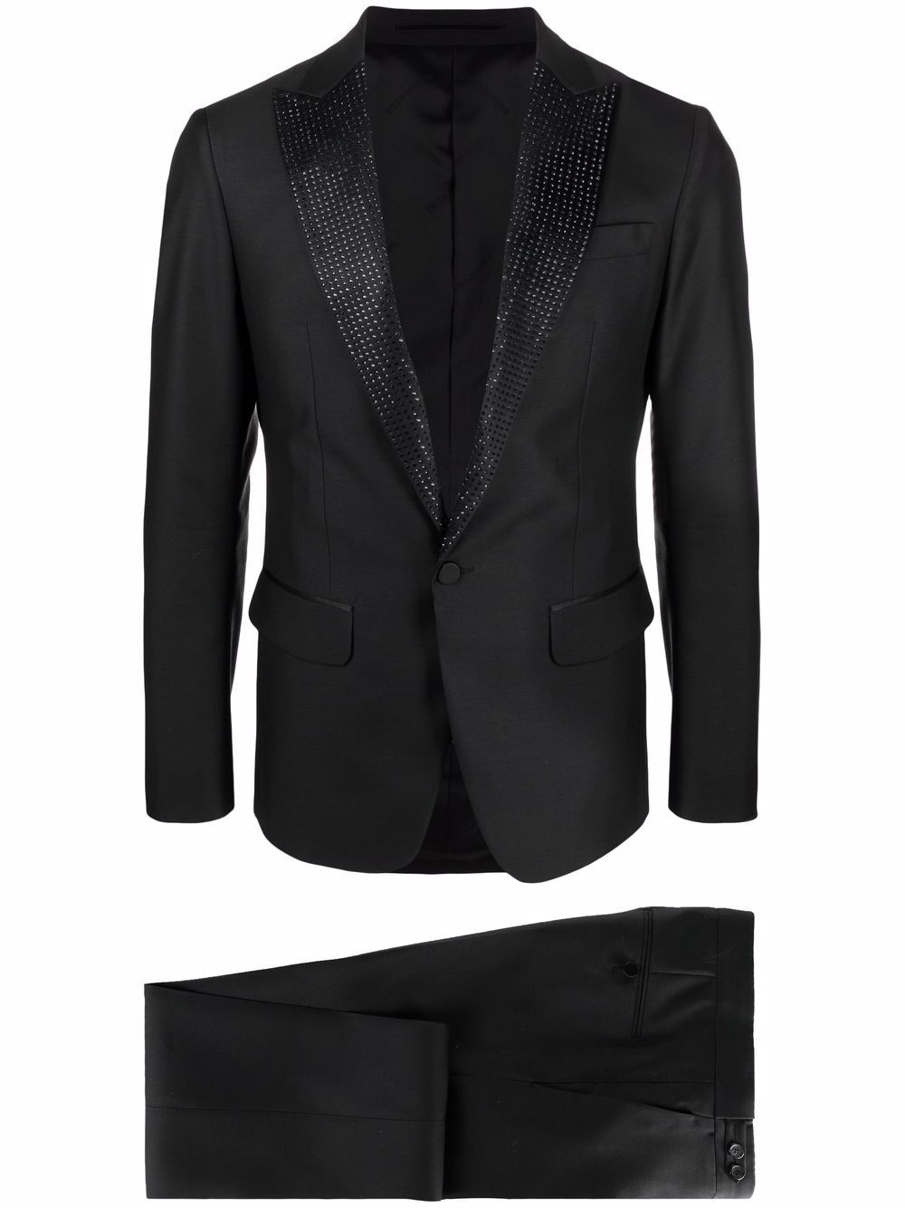 crystal-embellished single-breasted suit Add some sparkle to your suit with Dsquared2. This sleek single-breasted style is adorned with shimmering crystal at the lapels. Shine bright. Made in Italy Composition Outer: Virgin Wool 65%, Silk 35% Lining: Cotton 100%, Polyester 100% SIZE & FIT Model measurements Height 6 ft 2 in(1.87 m) Bust/Chest 36.41 in(92.5 cm) Hips 37 in(94 cm) Waist 29.52 in(75 cm) FittingInformation This piece fits true to size. We recommend you get your regular size Cut for a slim fit Made with a mid-weight non-stretch fabric Washing instructions Dry Clean Only