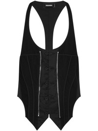 deconstructed panelled waistcoat A penchant for deconstruction underpins the design of Dsquared2’s waistcoat. It’s overlaid with piped corset-inspired panels illuminated with zip teeth that evoke an undone look. Highlights - Black - Panelled design - Decorative zip detailing - Scoop neck - Front button fastening - Sleeveless - Racerback - Pointed hem Made in Italy Composition Nylon 100%