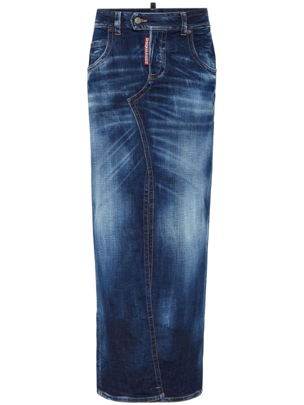 denim maxi skirt Highlights - Navy blue - Concealed fly and button fastening - Belt loops - Classic five pockets - Logo patch to the rear Made in Italy Composition Lining: Polyester 65%, Cotton 35% Outer: CALFSKIN 100%, Cotton 99%, Elastane 1%