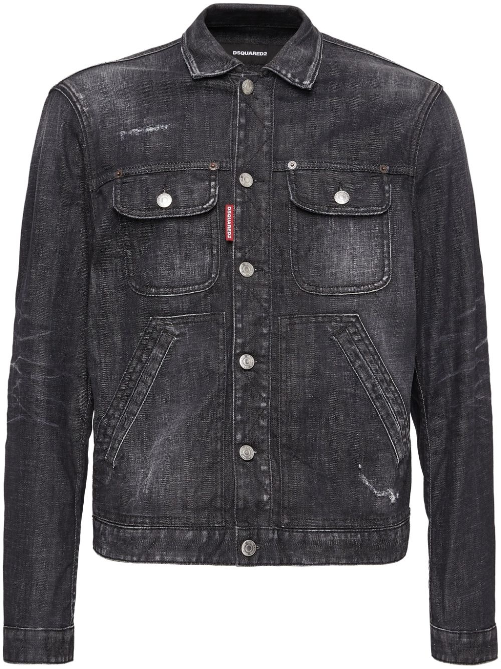 distressed denim jacket Highlights - Black - Cotton blend - Denim - Distressed finish - Classic collar - Front button fastening - Two chest flap pockets - Two side welt pockets - Long sleeves - Buttoned cuffs - Straight hem Made in Italy Composition Cotton 98%, Elastane 2%