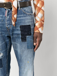 distressed-effect patchwork jeans Dsquared2's jeans align with the brand's affinity for distressed detailing. This straight-leg pair is made from blue denim and boasts a distressed finish that is combined with patchwork detailing to give them a lived-in appearance. Highlights - Blue - Cotton - Denim patchwork design - Distressed effect - Logo tag - Front button fastening - Belt loops - Classic five pockets - Straight leg Imported Composition Outer: Cotton 100% Lining: Polyester 65%, Cotton 35% SIZE & FIT Model measurements Height 6 ft 0 in(1.84 m) Bust/Chest 36.22 in(92 cm) Hips 35.43 in(90 cm) Waist 26.77 in(68 cm) FittingInformation This piece fits true to size. We recommend you get your regular size Regular fit Made with a mid-weight non-stretch fabric Washing instructions Dry Clean Only