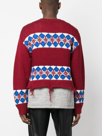 distressed-finish wool jumper bordeaux red/multicolour wool/cotton crochet panelling distressed finish contrasting panel detail crew neck long sleeves Imported Composition Cotton 100%, Wool 100% SIZE & FIT Model measurements Height 6 ft 2 in(1.88 m) Bust/Chest 36.61 in(93 cm) Hips 35.82 in(91 cm) Waist 27.95 in(71 cm) FittingInformation Designed for a relaxed fit, this piece allows for comfort and movement when worn Made from a midweight non-stretch fabric, this piece offers minimal elasticity when worn This piece fits true to size – take your usual size Washing instructions Dry Clean Only