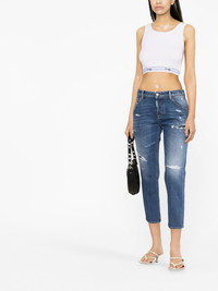 distressed slim-fit cropped jeans Cut to a cropped length for a modern look, these slim-fit jeans from Dsquared2 are presented in an indigo blue colourway with a stonewashed effect. The pair boasts distressed ripped detailing and is finished with a green logo patch on the rear. Highlights - Indigo blue - Stretch-cotton - Stonewashed - Distressed finish - Ripped detailing - Logo patch to the rear - Mid-rise - Belt loops - Front button and zip fastening - Classic five pockets - Slim cut - Cropped leg Made in Italy Composition Outer: Cotton 98%, Spandex/Elastane 2% Lining: Polyester 65%, Cotton 35% SIZE & FIT Model measurements Height 5 ft 10 in(1.77 m) Bust/Chest 32.67 in(83 cm) Hips 35.43 in(90 cm) Waist 23.62 in(60 cm) FittingInformation Designed for a skinny fit, these jeans offer a close fit throughout Cropped in length Constructed from stretch denim, this piece offers a stretch fit with durability This piece fits true to size – take your usual size Washing instructions Machine Wash