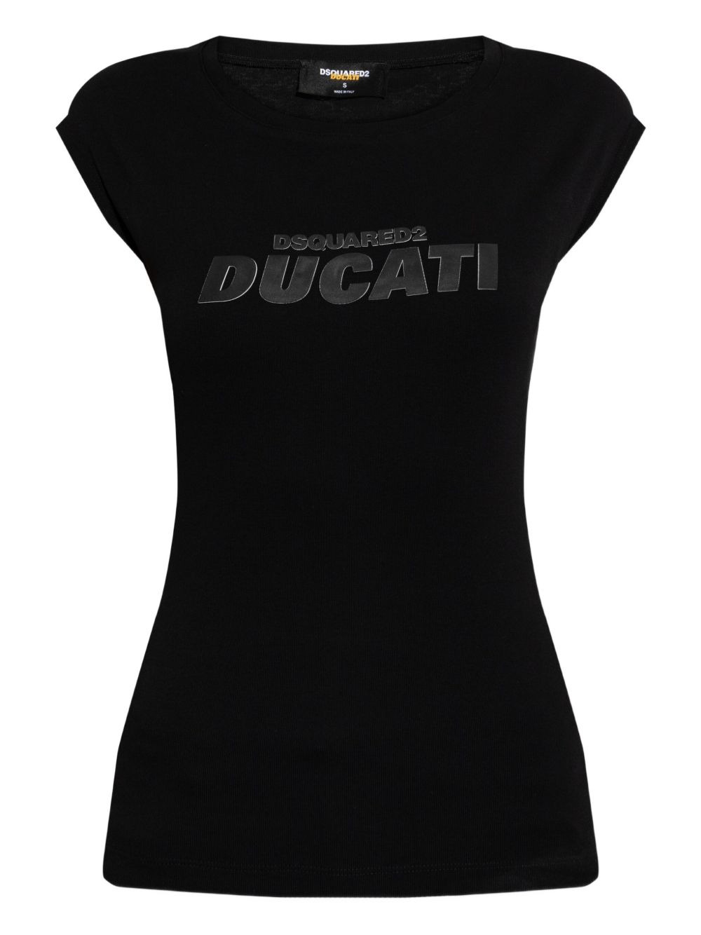 Ducati x D2 logo top Highlights - Black - Logo - Round neck - Short sleeves - Ribbed knit Made in Italy Composition Cotton 100% Washing instructions Read Manufacturer Guidelines