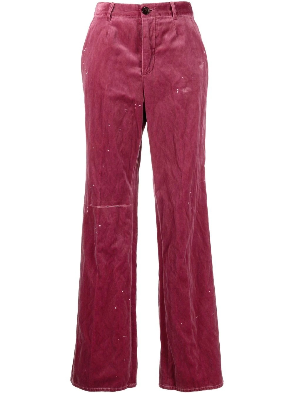 embroidered-logo velvet trousers embroidered-logo velvet trousers from DSQUARED2 featuring hot pink, cotton blend, high-waisted, velvet finish, paint splatter detail, front button and zip fastening, belt loops, embroidered logo to the rear, two side slit pockets, two rear welt pockets and wide leg. Made in Italy Composition Outer: Cotton 96%, Metallic Fibre 4% Lining: Cotton 100%, Polyester 100% SIZE & FIT Model measurements Height 5 ft 10 in(1.78 m) Bust/Chest 30.31 in(77 cm) Hips 36.61 in(93 cm) Waist 24.8 in(63 cm) FittingInformation This piece fits true to size. We recommend you get your regular size Designed to be fitted at the waist and hips, loose over the leg Made with a mid-weight non-stretch fabric Washing instructions Specialist Cleaning