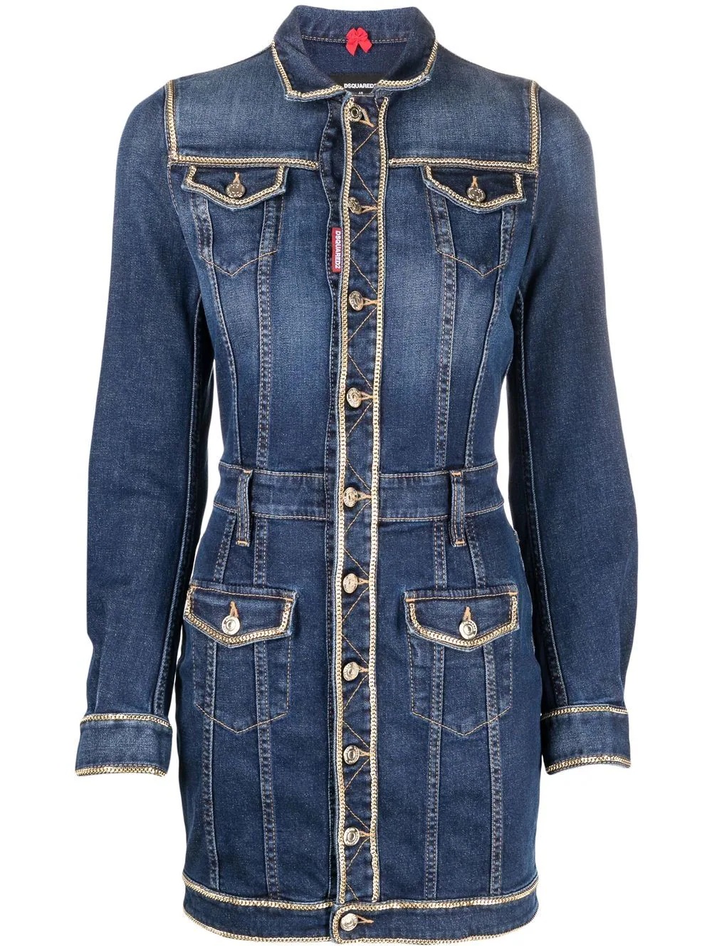 fitted denim shirt dress dark-blue stretch-cotton chain-link detailing contrast stitching classic collar front button fastening belt loops long sleeves buttoned cuffs front flap pockets fitted silhouette thigh-length Made in Italy Composition Aluminium 100%, Cotton 98%, Spandex/Elastane 2% SIZE & FIT Model measurements Height 5 ft 10 in(1.79 m) Bust/Chest 33.07 in(84 cm) Hips 35.82 in(91 cm) Waist 24.01 in(61 cm) FittingInformation This piece fits true to size. We recommend you get your regular size Cut for a slim fit Made with a mid-weight stretch fabric Washing instructions Dry Clean Only