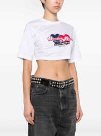 gathered cropped T-shirt Highlights - White - Cotton - Soft jersey - Crew neck - Short sleeves - Logo print to the front - Gathered detailing - Cropped - Straight hem - Concealed side zip fastening Made in Italy Composition Cotton 100% SIZE & FIT Model measurements Height 5 ft 11 in(1.8 m) Bust/Chest 33.07 in(84 cm) Hips 37 in(94 cm) Waist 25.59 in(65 cm) FittingInformation Designed for a slim fit that sits just away from the body offering a close yet comfortable fit Made from a midweight non-stretch fabric, this piece offers minimal elasticity when worn This piece fits true to size – take your usual size