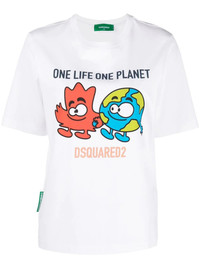 One Life Buddies-print T-shirt Dsquared2 sends a message of caring for the planet in its latest collection. This T-shirt features an encouraging eco-friendly statement on the front. Highlights - White/multicolour - Organic cotton - Graphic print to the front - Round neck - Short sleeves - Straight hem Made in Italy Composition Cotton 100% SIZE & FIT Model measurements Height 5 ft 10 in(1.77 m) Bust/Chest 32.28 in(82 cm) Hips 35.03 in(89 cm) Waist 25.19 in(64 cm) FittingInformation This piece fits true to size. We recommend you get your regular size Cut for a loose fit Made with a mid-weight fabric Washing instructions Dry Clean Only