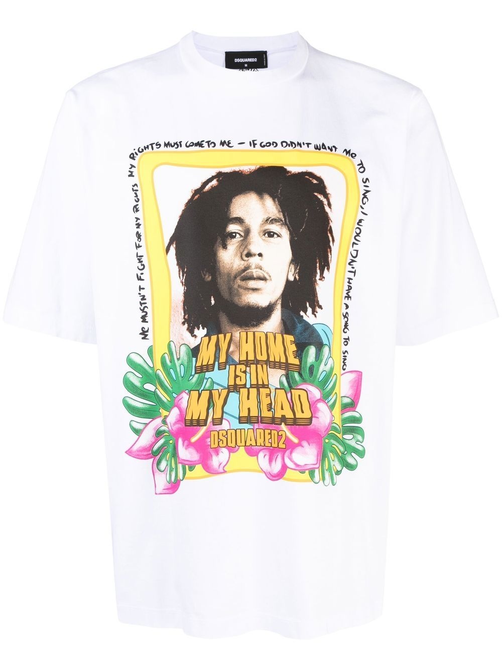 graphic-print short-sleeved T-shirt white/multicolour cotton graphic print to the front crew neck short sleeves straight hem Made in Italy Composition Cotton 100% SIZE & FIT Model measurements Height 6 ft 2 in(1.87 m) Bust/Chest 36.22 in(92 cm) Hips 37 in(94 cm) Waist 27.95 in(71 cm) FittingInformation This piece fits true to size. We recommend you get your regular size Cut for a relaxed fit Made with a mid-weight fabric Washing instructions Machine Wash