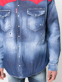 hooded hybrid denim jacket medium blue/red stretch-cotton washed denim paint splatter detail contrasting panel detail drawstring hood two chest patch pockets front press-stud fastening long sleeves curved hem Made in Italy Composition Outer: Polyamide 100%, Polyester 100%, Cotton 98%, Spandex/Elastane 2% Lining: Polyester 71%, Acrylic 29% SIZE & FIT Model measurements Height 6 ft 1 in(1.85 m) Bust/Chest 35.82 in(91 cm) Hips 37.79 in(96 cm) Waist 29.13 in(74 cm) FittingInformation This piece fits true to size. We recommend you get your regular size Cut for a loose fit Made with a mid-weight stretch fabric