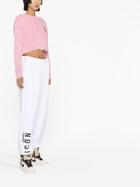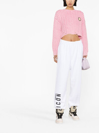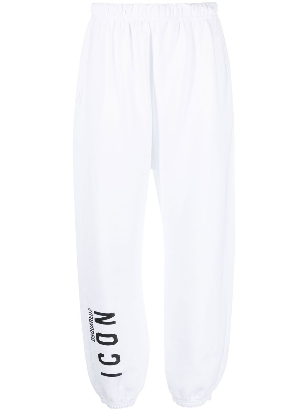 Icon logo jersey track pants The defining motif of DSquared2's sportswear pieces is the brand's ICON logo, which appears here as a contrasting branded finish against the striking white colourway. Made in Italy Composition Outer: Cotton 100% Lining: Cotton 100% SIZE & FIT Model measurements Height 5 ft 10 in(1.78 m) Bust/Chest 29.92 in(76 cm) Hips 34.64 in(88 cm) Waist 23.62 in(60 cm) FittingInformation This piece fits true to size. We recommend you get your regular size Designed to be loose over the leg with a fitted waist and hem Made with a mid-weight fabric Washing instructions Machine Wash