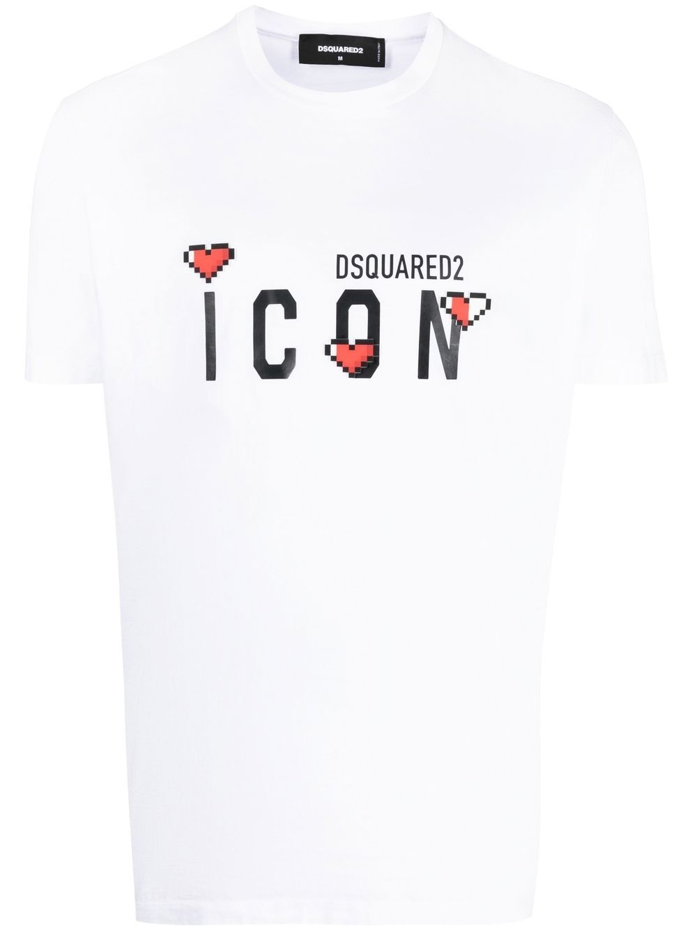 Icon logo-print T-shirt Dsquared2 offers a playful touch to its iconic Icon print with this T-shirt, adorned with a pixelated heart motif for AW23. Highlights - White - Cotton - Logo print to the front - Heart print - Round neck - Short sleeves - Straight hem Made in Italy Composition Cotton 100% SIZE & FIT Model measurements Height 6 ft 0 in(1.84 m) Bust/Chest 36.22 in(92 cm) Hips 35.43 in(90 cm) Waist 26.77 in(68 cm) FittingInformation This piece fits true to size. We recommend you get your regular size Cut for a slim fit Made with a mid-weight fabric Washing instructions Dry Clean Only