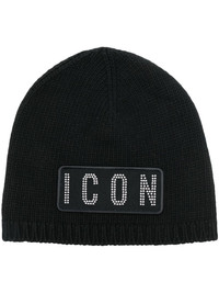 Icon-patch knitted beanie Spun with plush wool and cashmere threads, Dsquared2's beanie hat is topped with the brand's signature 'Icon' patch at the foldover hem. The word is illuminated with rows of miniature crystals. Made in Italy Composition Wool 47%, Viscose 30%, Polyamide 15%, Cashmere 8%
