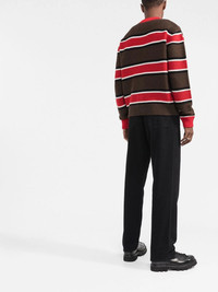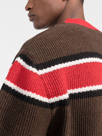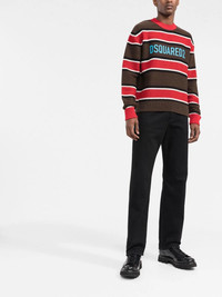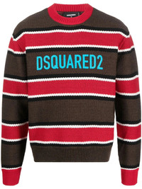 jacquard logo striped jumper Dsquared2 incorporates their logo into the virgin wool construction of this jumper. The contrasting branding pops against the knitted design, making it immediately recognisable. Highlights - Brown - Red - Virgin wool - Jacquard logo motif - Horizontal stripe pattern - Crew neck - Long sleeves - Ribbed trim Made in Italy Composition Virgin Wool 100% SIZE & FIT Model measurements Height 6 ft 2 in(1.88 m) Bust/Chest 35.03 in(89 cm) Hips 35.82 in(91 cm) Waist 27.95 in(71 cm) FittingInformation This piece fits true to size. We recommend you get your regular size Cut for a relaxed fit Made with a mid-weight fabric Washing instructions Hand Wash