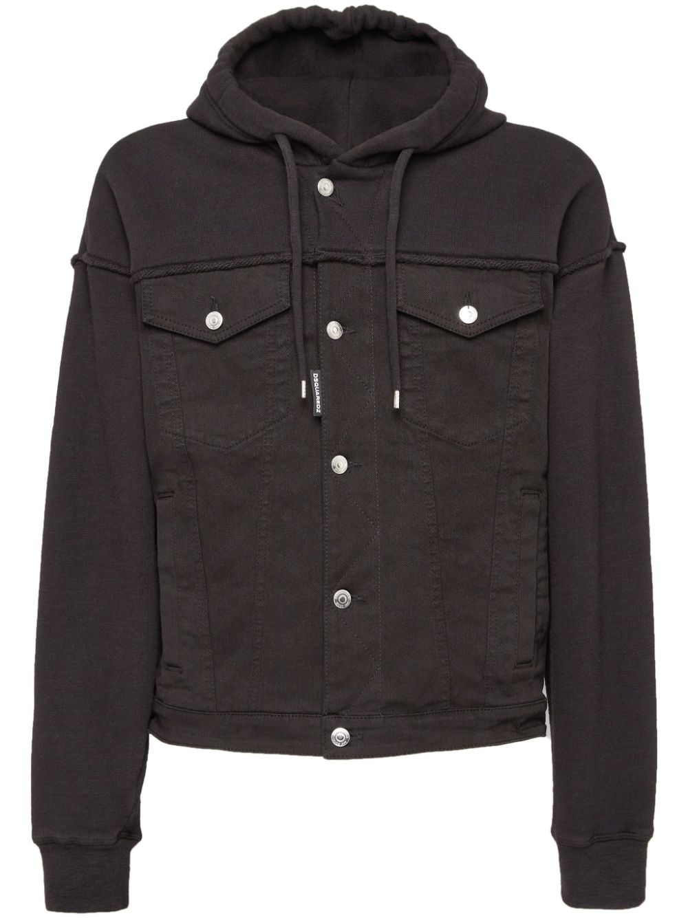 layered-hood denim jacket Highlights - Black - Cotton - Logo patch to the rear - Mini logo tag - Drawstring hood - Long sleeves - Ribbed cuffs - Two chest flap pockets - Two side slit pockets - Front button fastening - Straight hem Made in Italy Composition Cotton 98%, Elastane 2% Washing instructions Read Manufacturer Guidelines