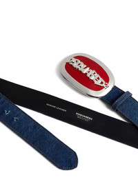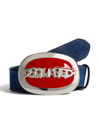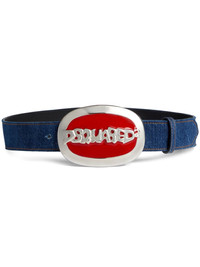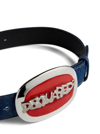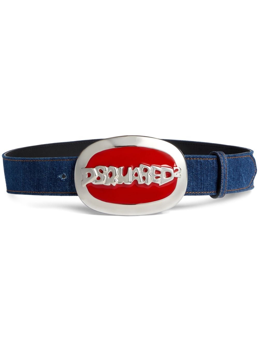 logo-buckle denim belt Highlights - Indigo blue/red - Calf leather - Denim - Contrast stitching - Logo-buckle fastening - Pointed tip - Punched holes - Adjustable fit Made In Italy Composition Calf Leather 100%, zamac 100%