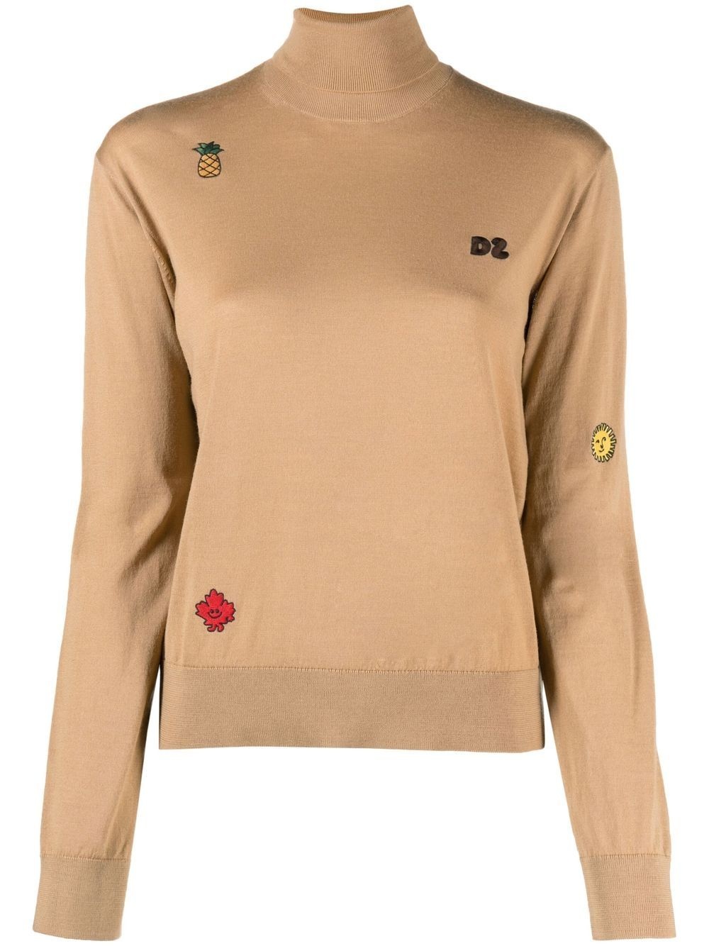 logo-embroidered roll-neck jumper Dsquared2's fun approach to fashion is displayed in this jumper. Distinct multicolour motifs, including a logo on the chest, provide a playful touch to this classic roll-neck design. Imported Composition Wool 100% SIZE & FIT Model measurements Height 5 ft 10 in(1.78 m) Bust/Chest 29.92 in(76 cm) Hips 34.64 in(88 cm) Waist 23.62 in(60 cm) FittingInformation This piece fits true to size. We recommend you get your regular size Cut for a loose fit Made with a mid-weight fabric