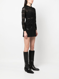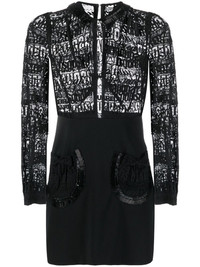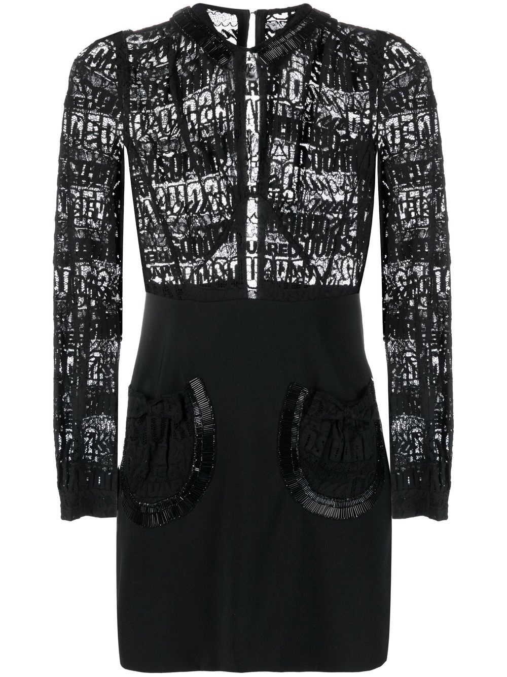 logo-lace long-sleeve minidress Dsquared2 provide a contemporary update to a classic style with this minidress. Arriving in a timeless black hue, the long-sleeve silhouette plays host to intricately constructed logo-lace panels on the upper half while bead and bow detailing combine for a delicate finish to the look. Highlights - Black - Lace detailing - Bead detailing - Two front pouch pockets - Classic collar - Long sleeves - Thigh-length - Straight hem Made in Italy Composition glass 100%, Polyamide 100%, Polyester 94%, Spandex/Elastane 6% SIZE & FIT Model measurements Height 5 ft 10 in(1.78 m) Bust/Chest 31.49 in(80 cm) Hips 36.22 in(92 cm) Waist 25.59 in(65 cm) FittingInformation This piece fits true to size. We recommend you get your regular size Designed for a close fit at the bust, waist and hips Made with a mid-weight fabric Washing instructions Dry Clean Only