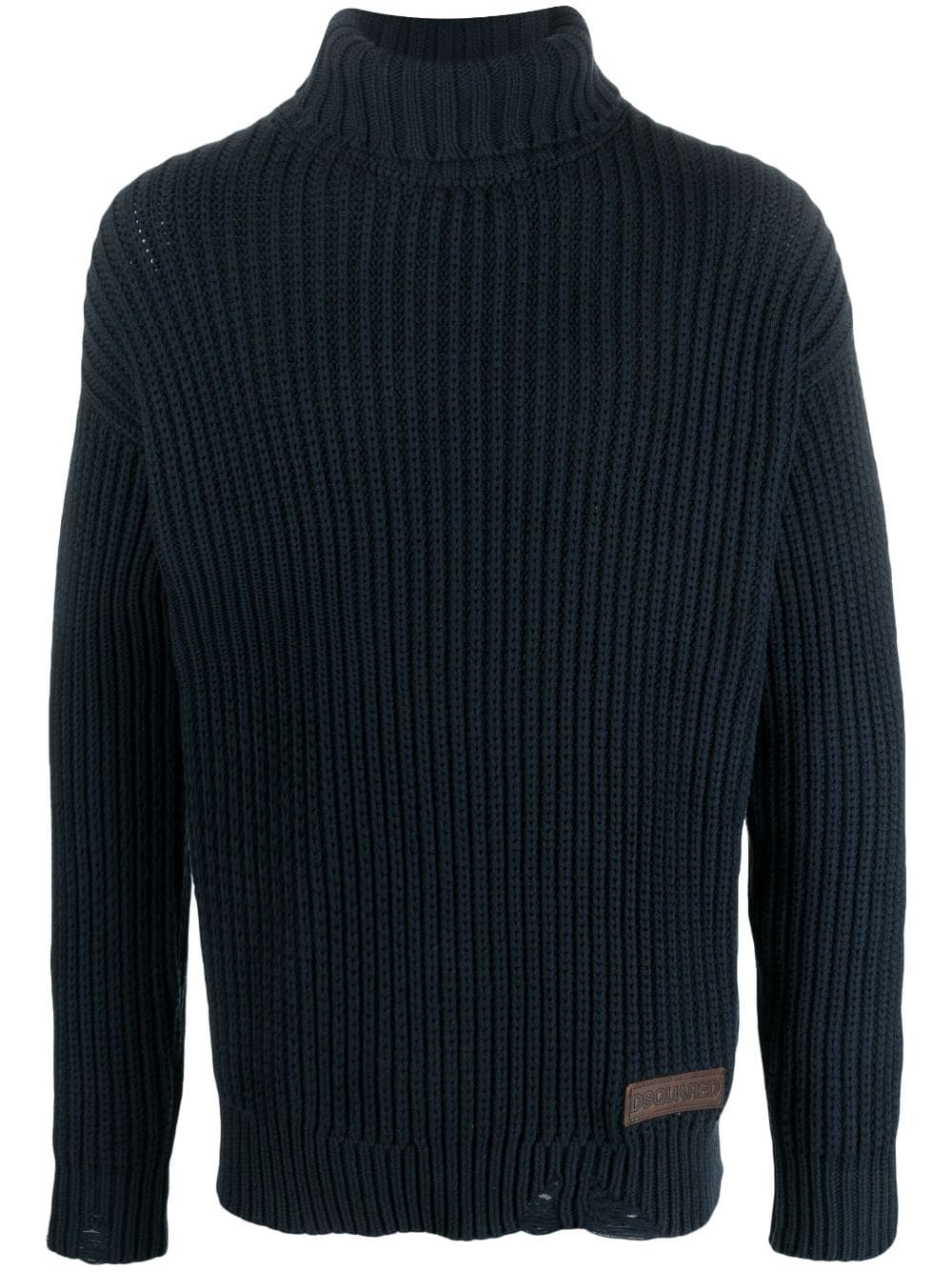 logo-patch roll-neck knitted jumper Highlights - Navy blue - Cotton blend - Chunky knit - Distressed finish - Logo patch to the side - Roll neck - Long sleeves - Ribbed cuffs and hem Made in Italy Composition Calf Leather 100%, Cotton 60%, Polyamide 40% SIZE & FIT Model measurements Height 6 ft 1 in(1.85 m) Bust/Chest 35.43 in(90 cm) Hips 35.82 in(91 cm) Waist 27.55 in(70 cm) FittingInformation Designed for a relaxed fit, this piece allows for comfort and movement when worn Made with a heavyweight knit, this piece offers some stretch This piece fits true to size – take your usual size Washing instructions Dry Clean Only