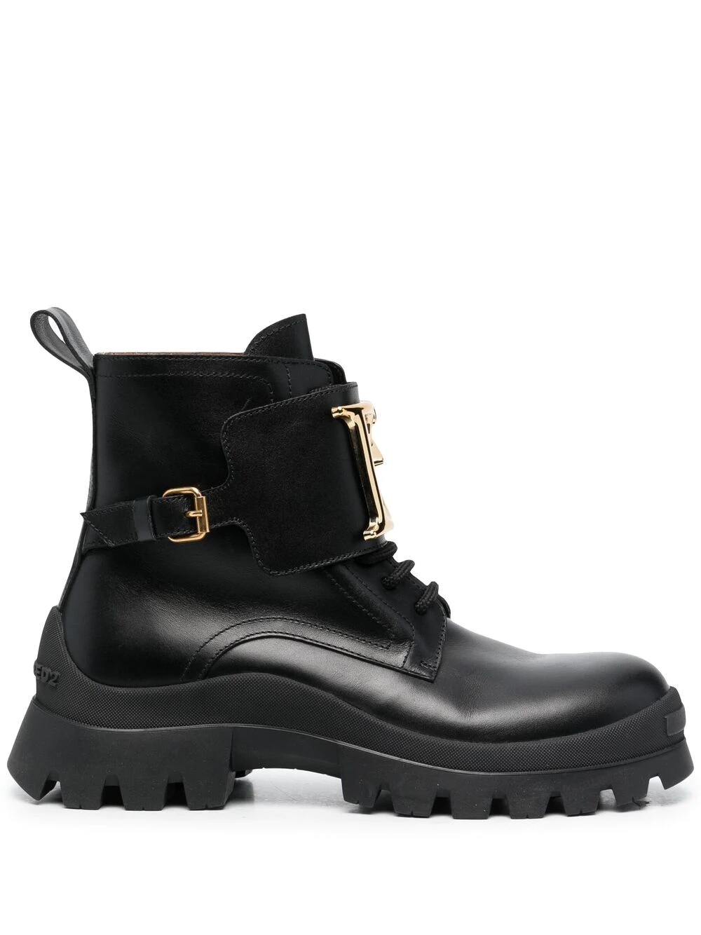 logo-plaque ankle boots Dsquared2 adds an opulent touch to the chunky silhouette of these ankle boots thanks to a gold-tone logo plaque. Appearing at the front of the pair, it contrasts against the black-hued leather for an eye-catching look. Made in Italy Composition Leather 100% SIZE & FIT Measurement HEEL 1.77 in(4.5 cm) HEIGHT 5.51 in(14 cm) Sole height 0.98 in(2.5 cm)