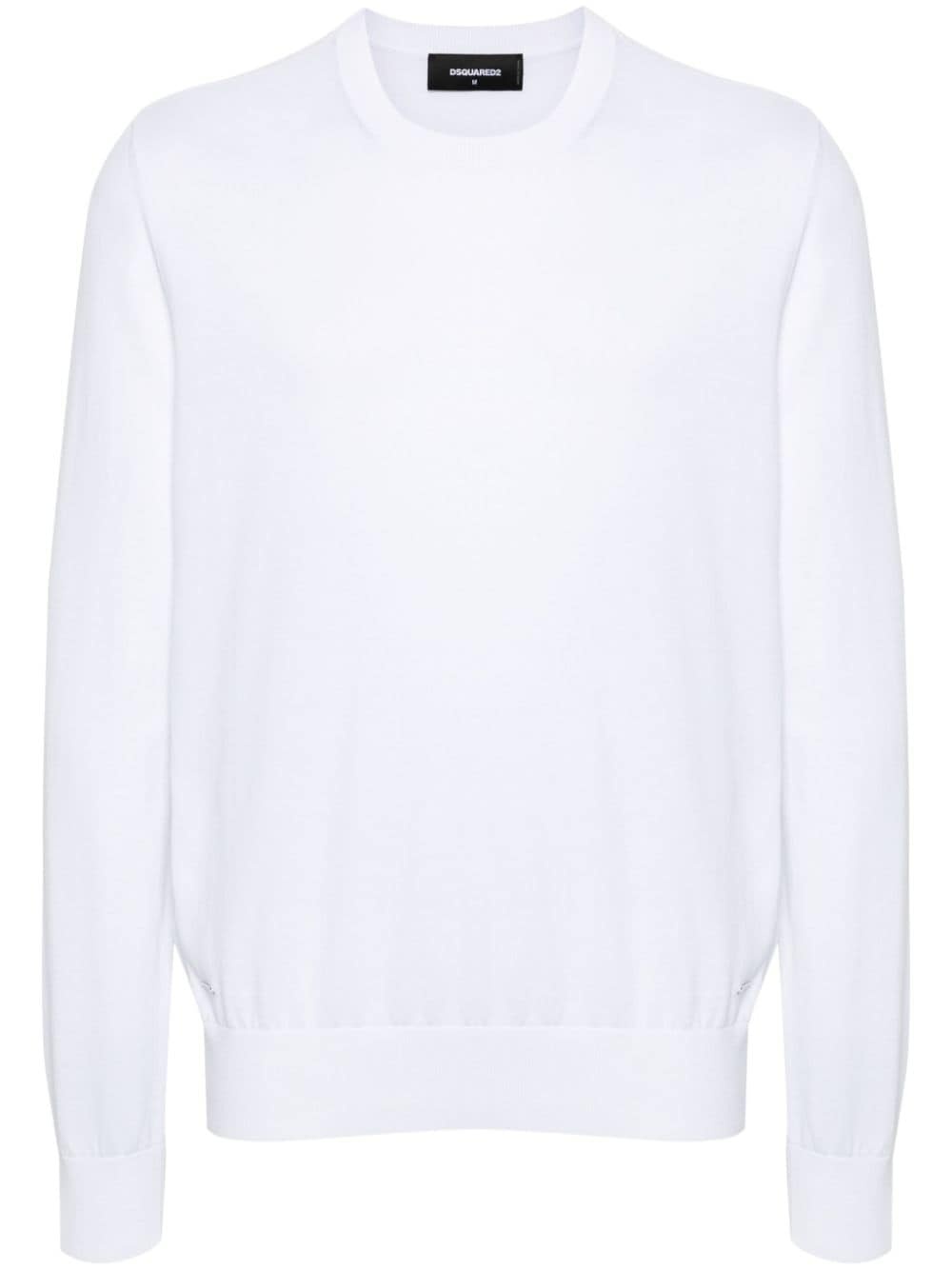 logo-plaque jumper Dsquared2 showcases its minimal style with this jumper. Finely knitted from cotton in a crisp white colour, the long-sleeve silhouette is simply adorned with a logo plaque by the hem. Highlights - Optical white - Cotton - Knitted construction - Crew neck - Long sleeves - Ribbed cuffs and hem - Silver-tone logo plaque to the side - Internal logo tag - Straight hem Imported Composition Cotton 100% SIZE & FIT Model measurements Height 6 ft 1 in(1.86 m) Bust/Chest 37.4 in(95 cm) Hips 36.22 in(92 cm) Waist 29.52 in(75 cm) FittingInformation Designed for a relaxed fit, this piece allows for comfort and movement when worn Made with a midweight knit, this piece offers some stretch This piece fits true to size – take your usual size Washing instructions Hand Wash