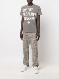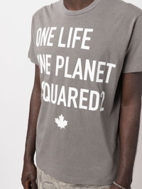 logo-print cotton T-shirt Printed with a slogan-style logo print to its front reading 'one life one planet', this Dsquared2 T-shirt is crafted in a grey cotton design, exhibiting the brand's street-ready appeal. Highlights - Grey - Cotton - Logo print to the front - Crew neck - Short sleeves - Straight hem Made in Italy Composition Cotton 100% SIZE & FIT Model measurements Height 6 ft 2 in(1.87 m) Bust/Chest 36.41 in(92.5 cm) Hips 37 in(94 cm) Waist 29.52 in(75 cm) FittingInformation This piece fits true to size. We recommend you get your regular size Cut for a slim fit Made with a mid-weight fabric Washing instructions Machine Wash