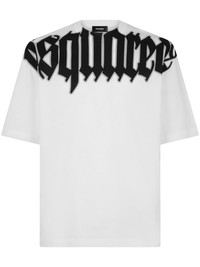 logo-print cotton T-shirt Boasting a contrasting black logo lettering print at the front, this Dsquared2 cotton-spun T-shirt reflects the brand's bold graphic identity. Highlights - White/black - Cotton - Logo print to the front - Crew neck - Short sleeves - Drop shoulder - Straight hem Made in Italy Composition Cotton 100%