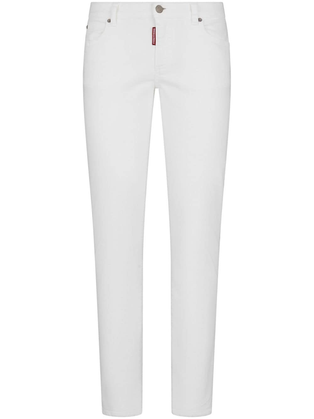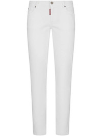 low-rise slim-cut jeans Dsqaured2 opts for a minimalist approach when designing these white jeans. Crafted in Italy, they boast a slim, low-rise silhouette simply accented with a leather logo patch on the back. Highlights - White - Cotton blend - Denim - Logo patch to the rear - Low-rise - Concealed fly and button fastening - Classic five pockets - Slim cut Made in Italy Composition Outer: Calf Leather 100%, Cotton 92%, Polyester 5%, Spandex/Elastane 3% Lining: Cotton 100% SIZE & FIT FittingInformation Designed for a skinny fit, these jeans offer a close fit throughout Constructed from stretch denim, this piece offers a stretch fit with durability This piece fits true to size – take your usual size Washing instructions Read Manufacturer Guidelines