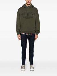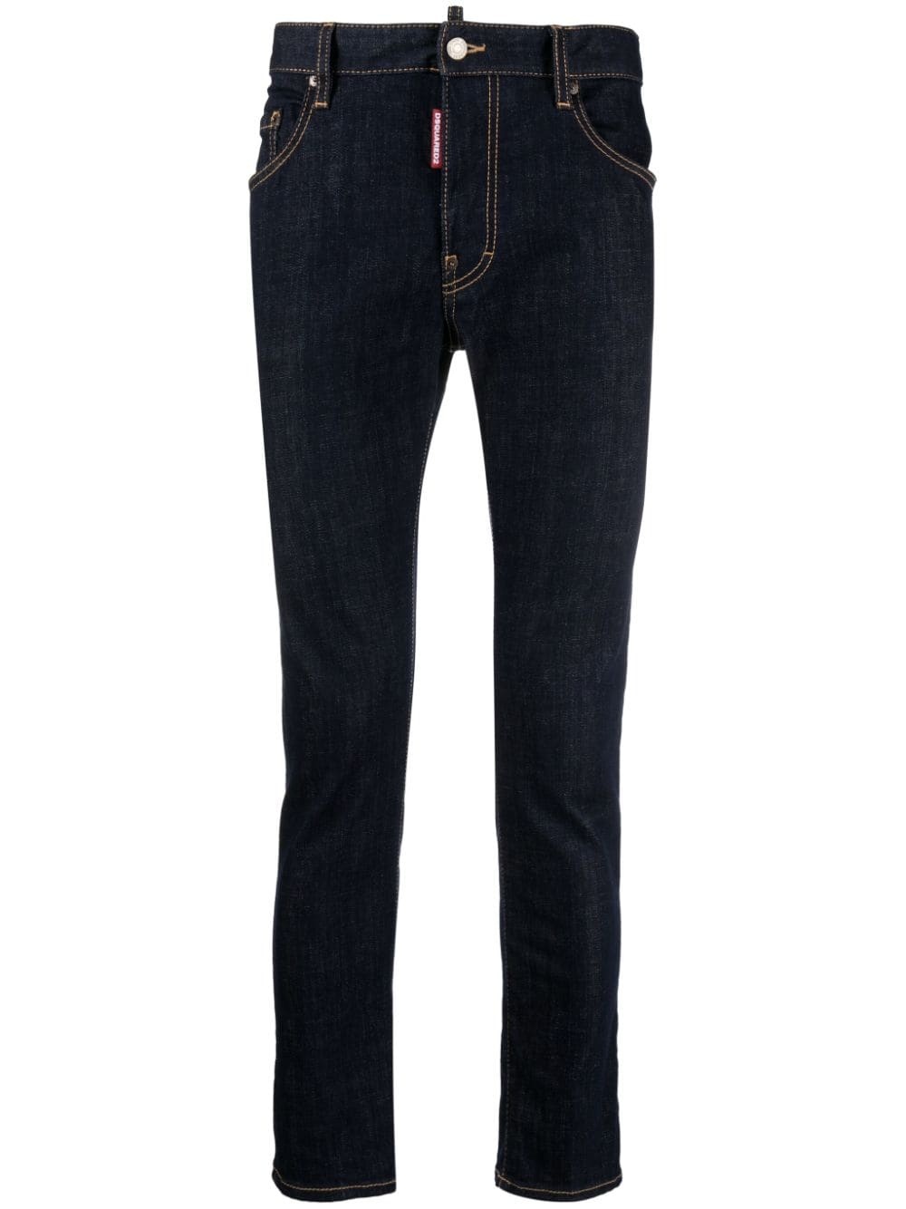 mid-rise skinny jeans These deep-blue skinny jeans from Dsquared2 are crafted from classic stretch cotton. Showing a characteristic design of contrasting-beige stitching, the pair is elevated with the brand's red and white logo tag, placed on the zip fastening. Highlights - Indigo blue - Stretch-cotton - Denim - Contrast stitching - Mini logo tag - Logo patch to the rear - Skinny cut - Mid-rise - Button fly fastening - Belt loops - Classic five pockets Imported Composition Lining: Polyester 65%, Cotton 35% Outer: Cotton 99%, Elastane 1% SIZE & FIT Model measurements Height 6 ft 2 in(1.89 m) Bust/Chest 37.4 in(95 cm) Hips 35.03 in(89 cm) Waist 27.95 in(71 cm) FittingInformation Designed for a skinny fit, these jeans offer a close fit throughout Constructed from stretch denim, this piece offers a stretch fit with durability This piece fits true to size – take your usual size