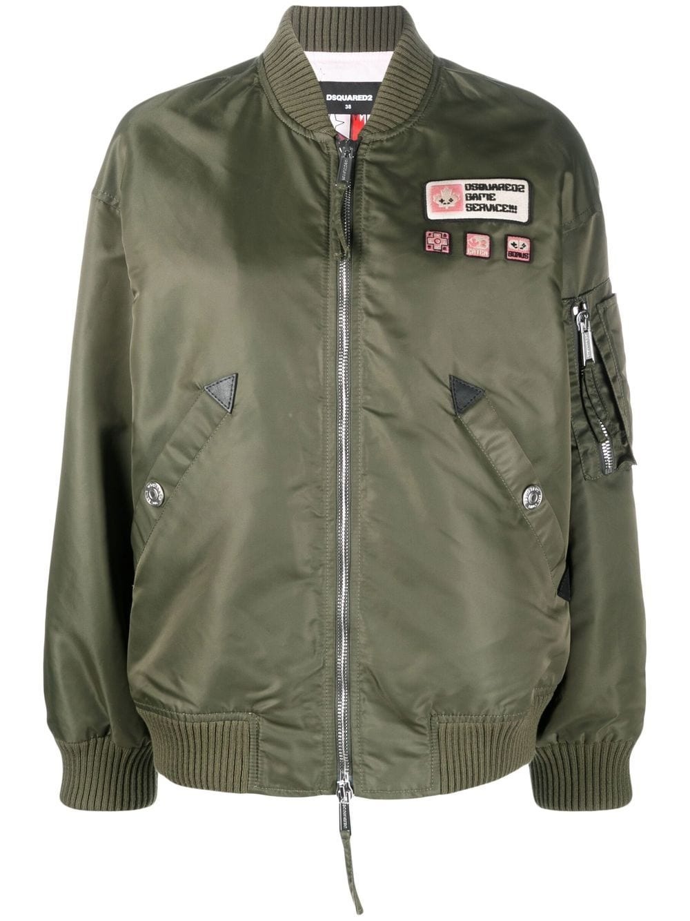 patch-detail bomber jacket This bomber jacket offers a utilitarian-inspired aesthetic favoured by Dsquared2. The green design boasts chest patch details and welt pockets. Made in Italy Composition Lining: Viscose 100%, Cotton 100% Outer: Cotton 100%, Polyamide 100% SIZE & FIT Model measurements Height 5 ft 10 in(1.79 m) Bust/Chest 31.1 in(79 cm) Hips 35.03 in(89 cm) Waist 24.01 in(61 cm) FittingInformation This piece fits true to size. We recommend you get your regular size Cut for a loose fit Made with a mid-weight non-stretch fabric Washing instructions Dry Clean Only