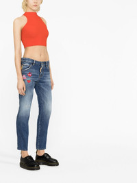 patch-detail denim jeans Dsquared2 brings together Canadian iconography and refined Italian tailoring on this pair of AW23 collection denim jeans. Featuring a sleek, straight-leg silhouette, bright patch detailing across the design creates an eye-catching effect. Made in Italy Composition Lining: Polyester 65%, Cotton 35% Outer: Cotton 100% SIZE & FIT Model measurements Height 5 ft 10 in(1.79 m) Bust/Chest 31.49 in(80 cm) Hips 35.03 in(89 cm) Waist 23.62 in(60 cm) FittingInformation Designed for a skinny fit, these jeans offer a close fit throughout Sturdy and hard-wearing, this denim piece offers no stretch This piece fits true to size – take your usual size Washing instructions Dry Clean Only