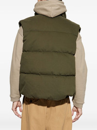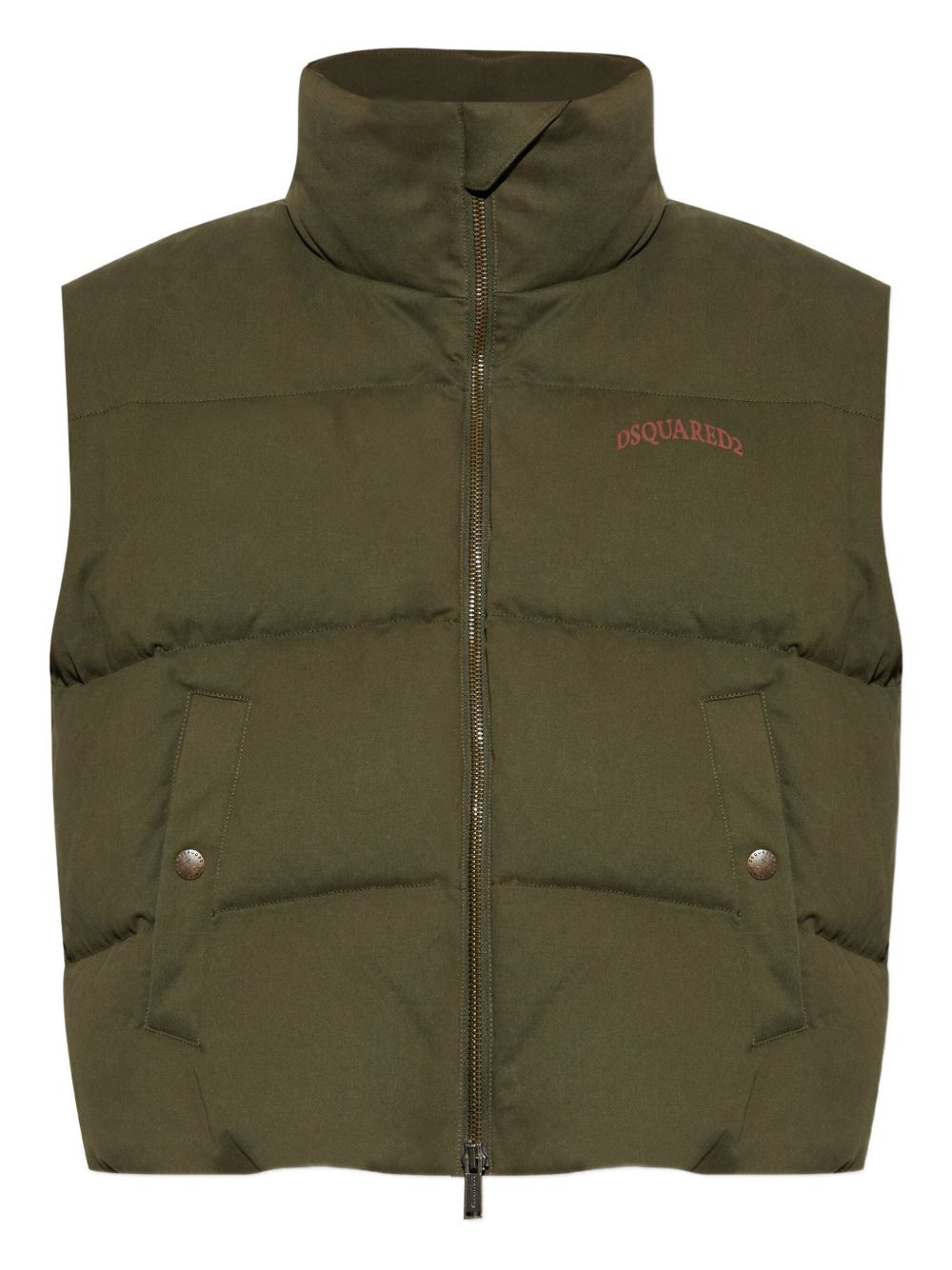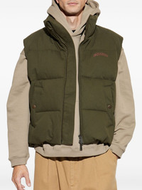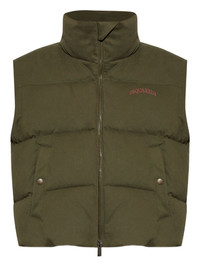 quilted logo vest Highlights - Olive green - Quilted design - High neck - Zip fastening - Welt pockets - Logo embroidery Made in Italy Composition Outer: Cotton 97%, Spandex/Elastane 3% Lining: Down 90%, Feather 10% Washing instructions Read Manufacturer Guidelines