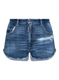 ripped-detail denim shorts Highlights - Indigo blue - Concealed fly and button fastening - Classic five pockets - Belt loops - Logo patch to the rear Made in Italy Composition Cotton 93%, Polyester 4%, Elastane 3%