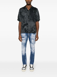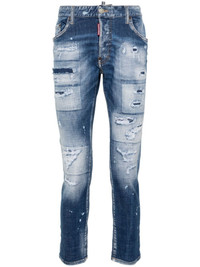 distressed slim-leg jeans These Dsquared2 jeans are cut from stretch denim to maintain the slim profile and heavily distressed and faded with shredded holes and ghost patches. The buttoned tabs at the back of the waistband can operate in lieu of a belt for an adjustable fit. Highlights - Indigo blue - Stretch-cotton - Washed denim - Distressed finish - Ripped detailing - Bleach splatter detail - Mid-rise - Belt loops - Mini logo tag - Classic five pockets - Button waist tabs - Logo patch to the rear - Slim cut - Front button fastening Imported Composition Outer: Cotton 93%, Polyester 4%, Spandex/Elastane 3% Lining: Polyester 65%, Cotton 35% SIZE & FIT Model measurements Height 6 ft 2 in(1.88 m) Bust/Chest 36.61 in(93 cm) Hips 35.82 in(91 cm) Waist 27.95 in(71 cm) FittingInformation Designed for a slim fit, these jeans offer a comfortable fit that sits just away from the leg Constructed from stretch denim, this piece offers a stretch fit with durability This piece fits true to size – take your usual size Washing instructions Machine Wash