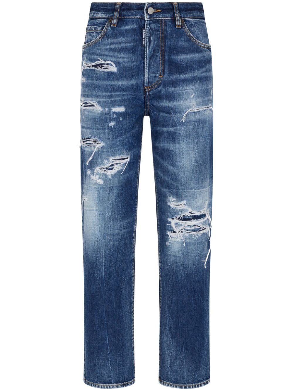 ripped straight-leg jeans Cut to a straight-leg silhouette, these Dsquared2 jeans are decorated with ripped detailing. Highlights - Blue - Cotton - Ripped detailing - Mini logo tag - Belt loops - Front button and fly fastening - Logo patch on the back - Straight leg - Classic five pockets Imported Composition Lining: Polyester 65%, Cotton 35% Outer: Cotton 100%, Calf Leather 100% Washing instructions Read Manufacturer Guidelines