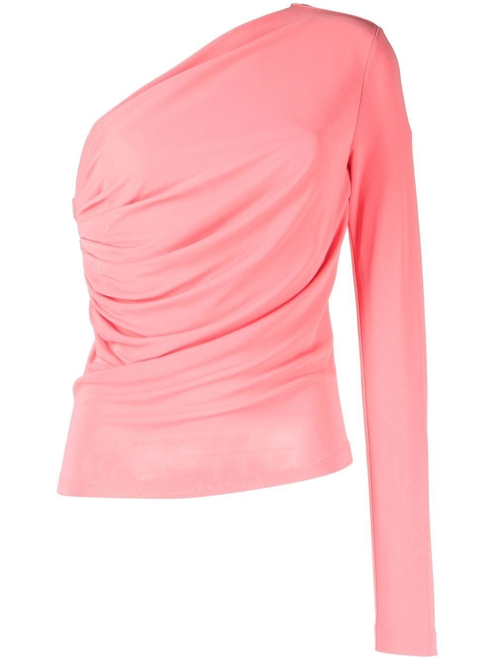ruched one-sleeve T-shirt light pink one-shoulder single long sleeve square neck straight hem Made in Italy Composition Viscose 100% SIZE & FIT Model measurements Height 5 ft 11 in(1.8 m) Bust/Chest 28.34 in(72 cm) Hips 35.43 in(90 cm) Waist 23.62 in(60 cm) FittingInformation This piece fits true to size. We recommend you get your regular size Cut for a close fit Made with a mid-weight fabric Washing instructions Dry Clean Only