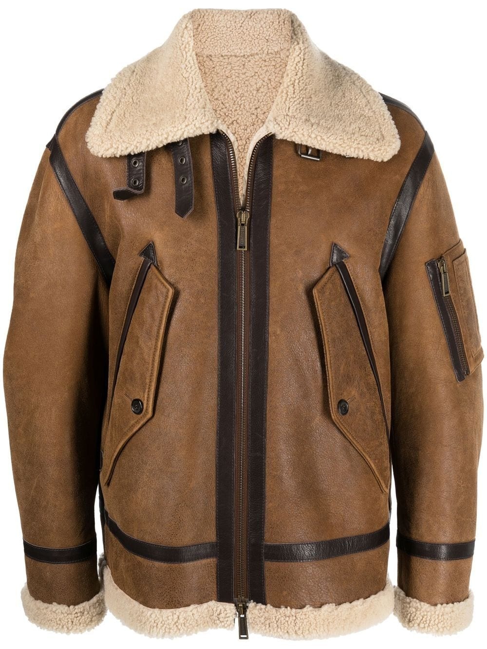 shearling-trimmed biker jacket caramel brown/light beige sheepskin shearling trim spread collar front zip fastening long sleeves sleeve zip pocket straight hem Imported Composition Sheep Skin/Shearling 100% SIZE & FIT Model measurements Height 6 ft 1 in(1.85 m) Bust/Chest 35.82 in(91 cm) Hips 37.79 in(96 cm) Waist 29.13 in(74 cm) FittingInformation This piece fits true to size. We recommend you get your regular size Cut for a loose fit Made with a mid-weight non-stretch fabric