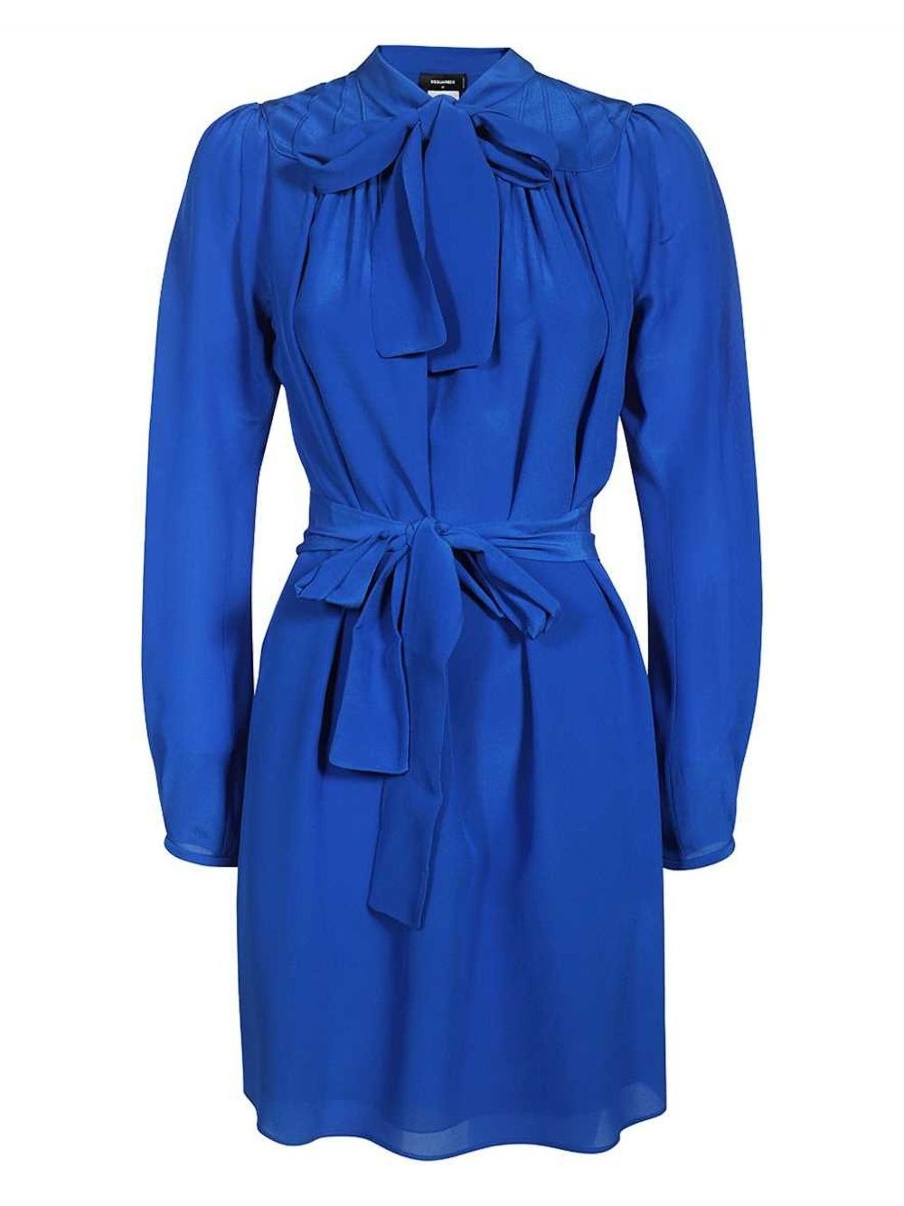 silk dress Highlights - Electric blue - Concealed front button fastening - Belted waist - Gathered tie neck - Long sleeves Made in Italy Composition Silk 100%