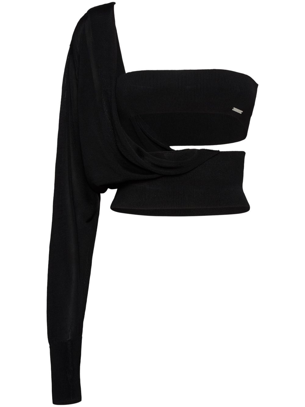 single-sleeved top Highlights - Black - Knitted construction - Single long sleeve - Asymmetric neck - Logo plaque - Cut-out detailing - Straight hem - Cropped Made in Italy Composition Viscose 95%, Polyamide 4%, Elastane 1%