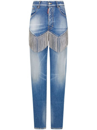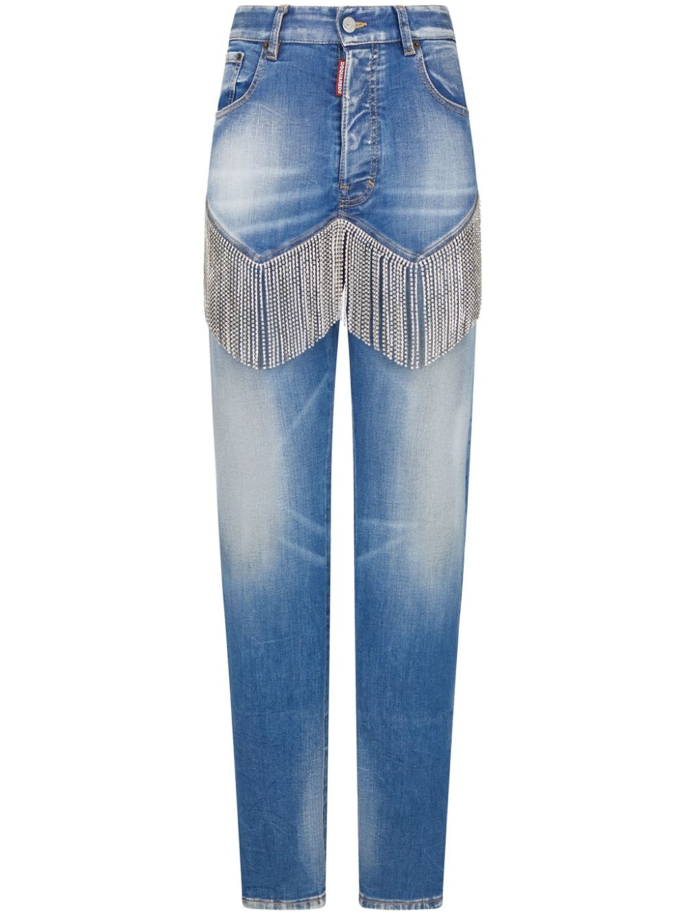 slim-cut rhinestone-fringe jeans Highlights - Light blue - Stretch-cotton/calf leather - Denim - Stonewashed - Whiskering effect - Rhinestone embellishment - Logo tag - Fringe detailing - Slim cut - Mid-rise - Belt loops - Front button and zip fastening - Classic five pockets Made in Italy Composition Outer: Calf Leather 100%, Cotton 92%, Polyester 6%, Spandex/Elastane 2% Lining: Polyester 65%, Cotton 35% Washing instructions Read Manufacturer Guidelines